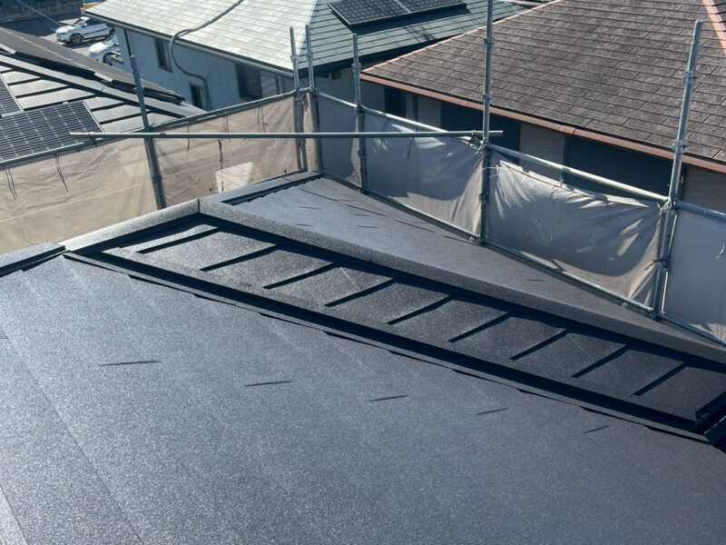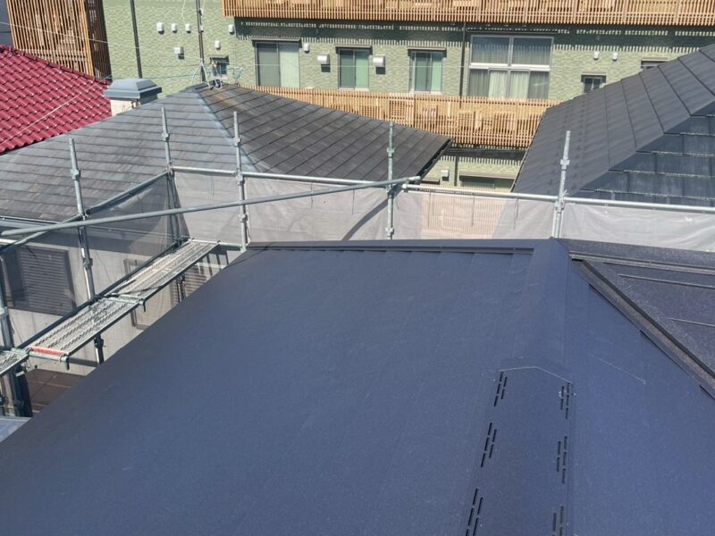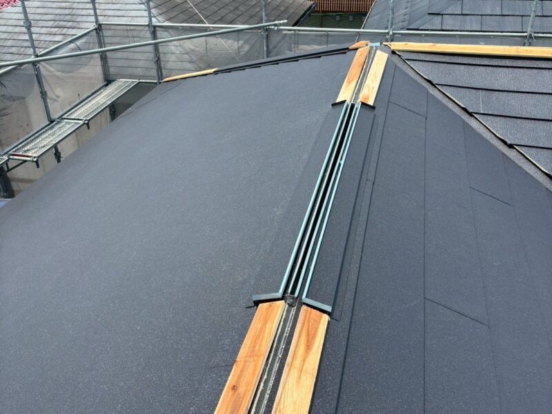 役物を取りつけ屋根を貼っていきます。換気棟施工