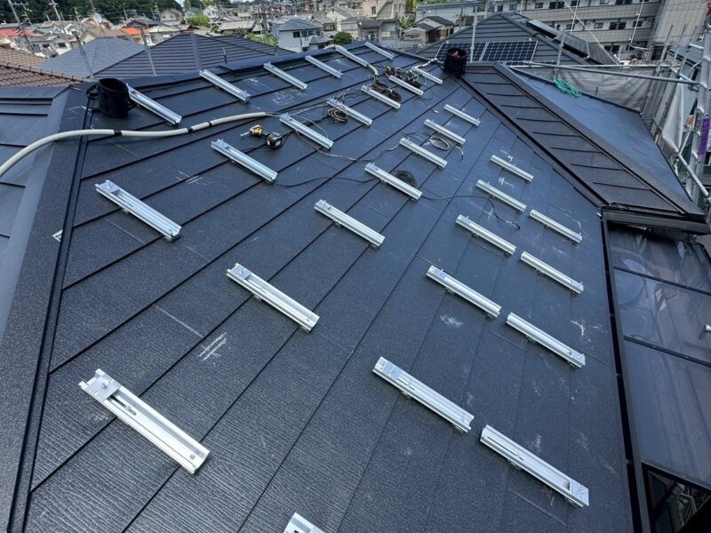 屋根が終わり太陽光を復旧します。今度は取り付け方が変わりキャッチ式の金具へ変わりました。屋根に穴をあけない安心方法です。パネル取り付け
