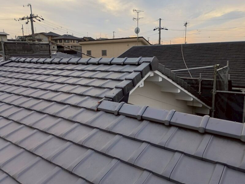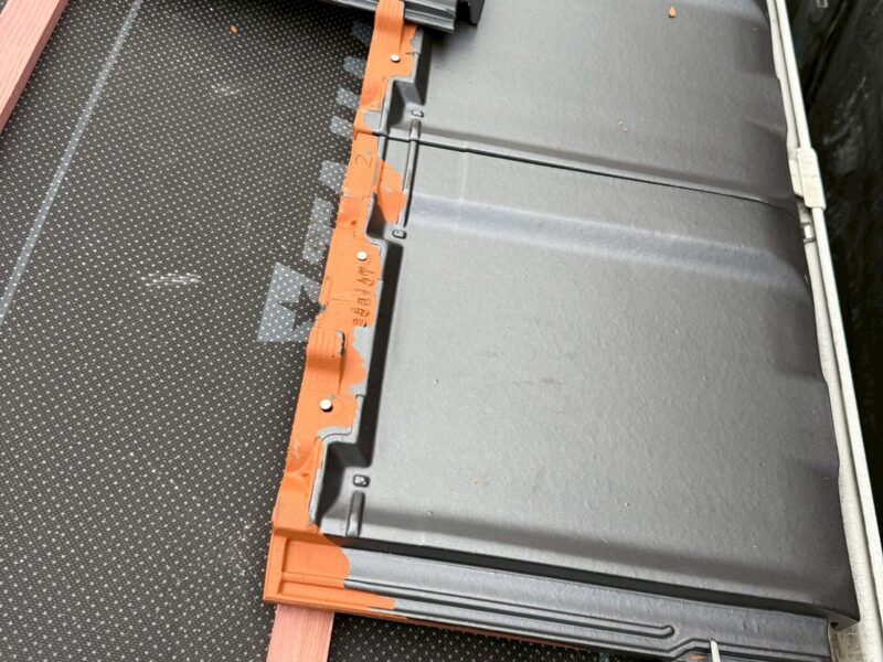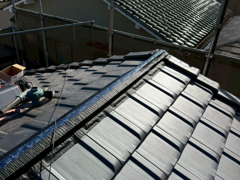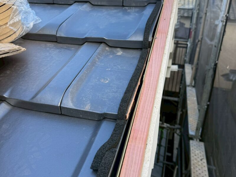 瓦の切れ目にシーラーを施工。瓦の下には隠れていますが水切り板金が仕込まれています。万が一瓦端から水が入っても板金材の上を通り雨樋まで運ばれます。二重保険で安心ですね。