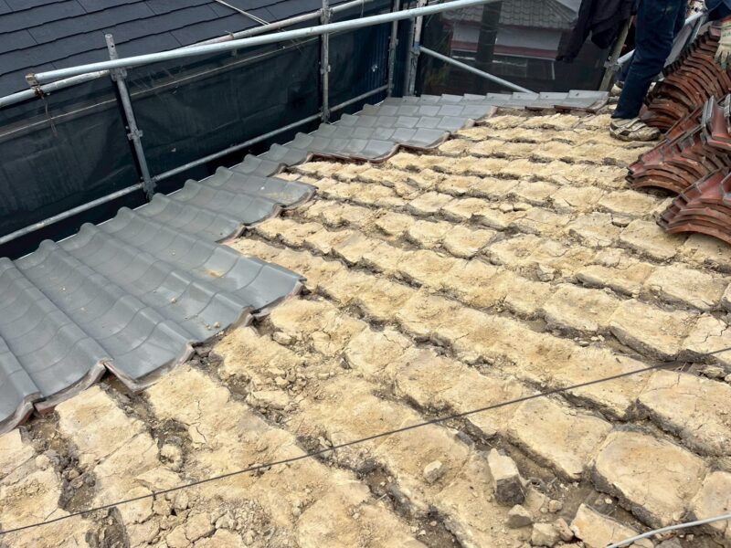 長年頑張ってくれた瓦達に屋根を降りてもらいます。今までお疲れさまでした。