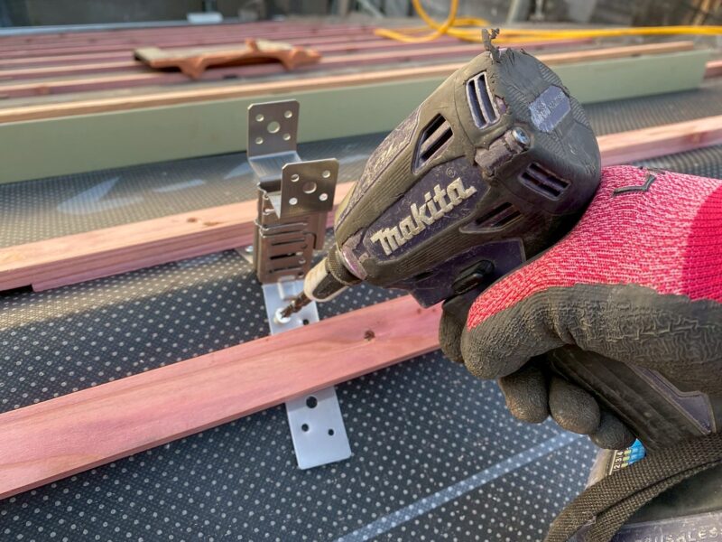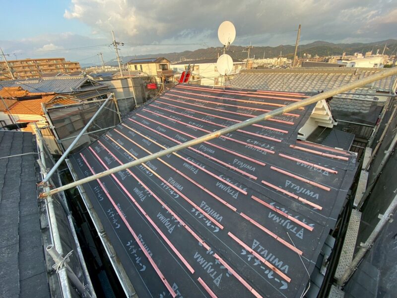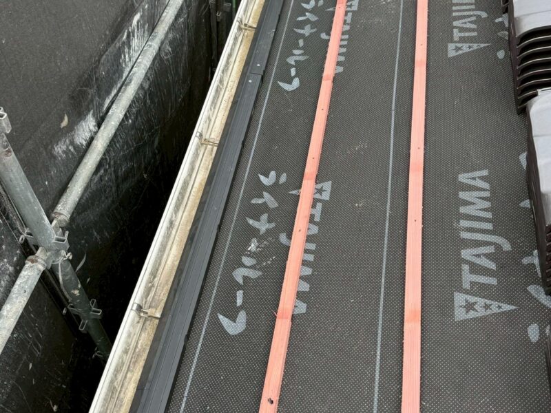 桟葺きにするため、瓦桟を打っていきます。この桟に瓦か引っかかりズレなくなります。