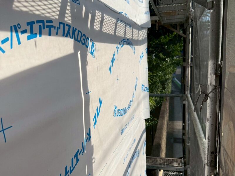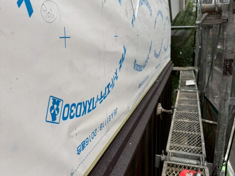 ようやく木下地に変わりました、湿気等で木地を傷めないよう防水紙を貼ります。