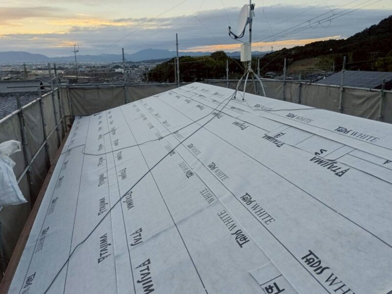 野地板の上に防水紙を貼ります。これで雨降ってもとりあえず大丈夫です。