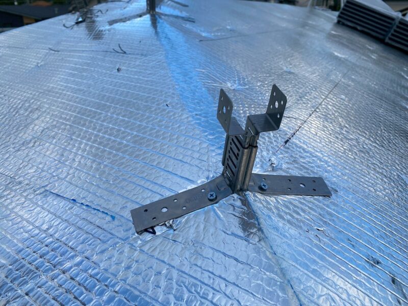地瓦が完了し、先程の棟金具に垂木を固定。
