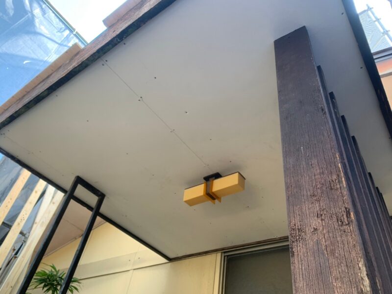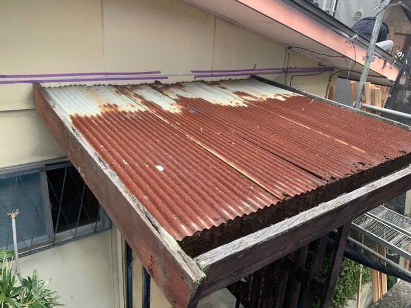 玄関屋根も葺き替えで聞いています。トタンをめくっていきましょう。サビが出てますね。