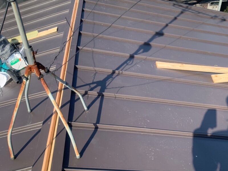 屋根と壁の取り合い部分に水が入らないように板金材を取り付けるための木下地を取り付けます。