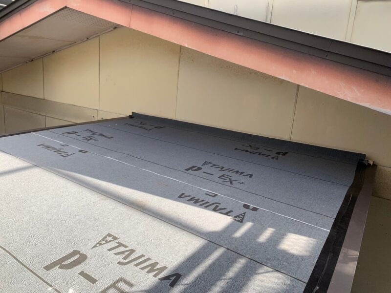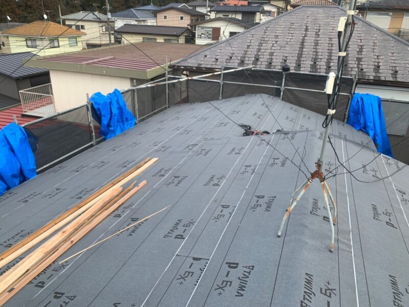 しっかりと防水紙を施工していきます。屋根を貼ってしまうと見えなくなってしまいますが屋根は下地が命。下地で手を抜くとあとで困るのは施主さんです。